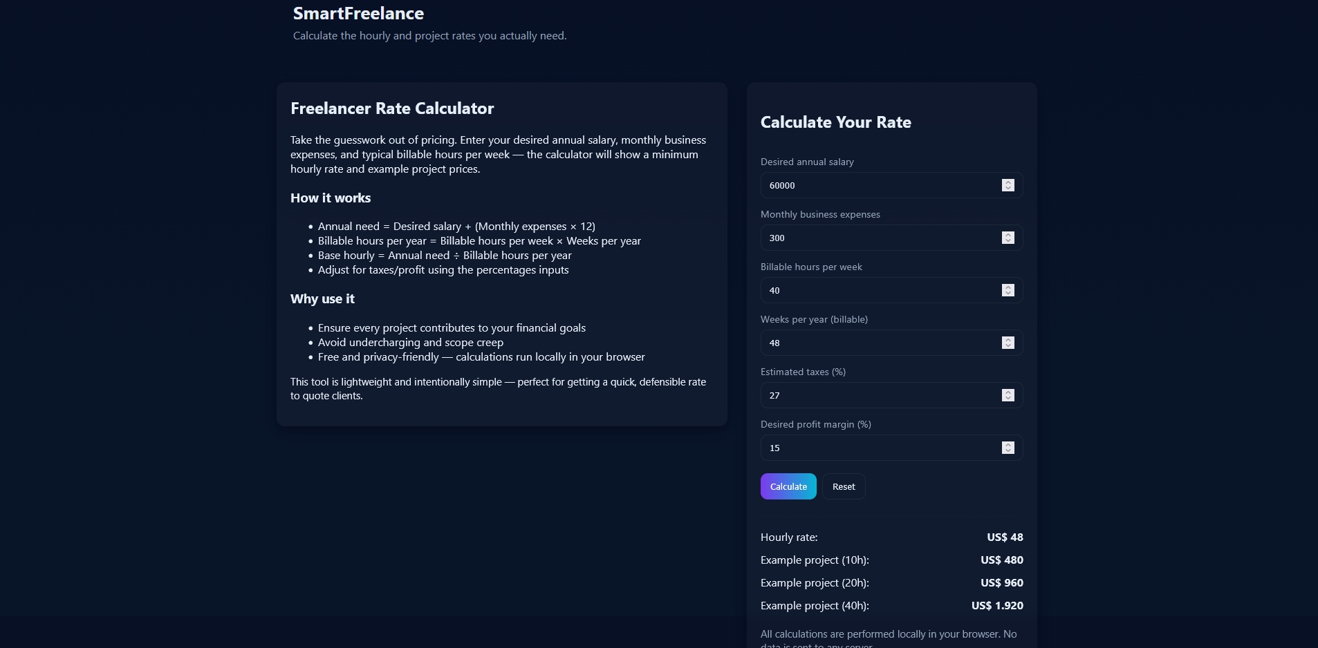 https://smart-freelance.sidepocketlab.com | Calculate the hourly and project rates you actually need. Simple, privacy-first calculator for freelancers. Simple HTML, CSS and Vanila JS